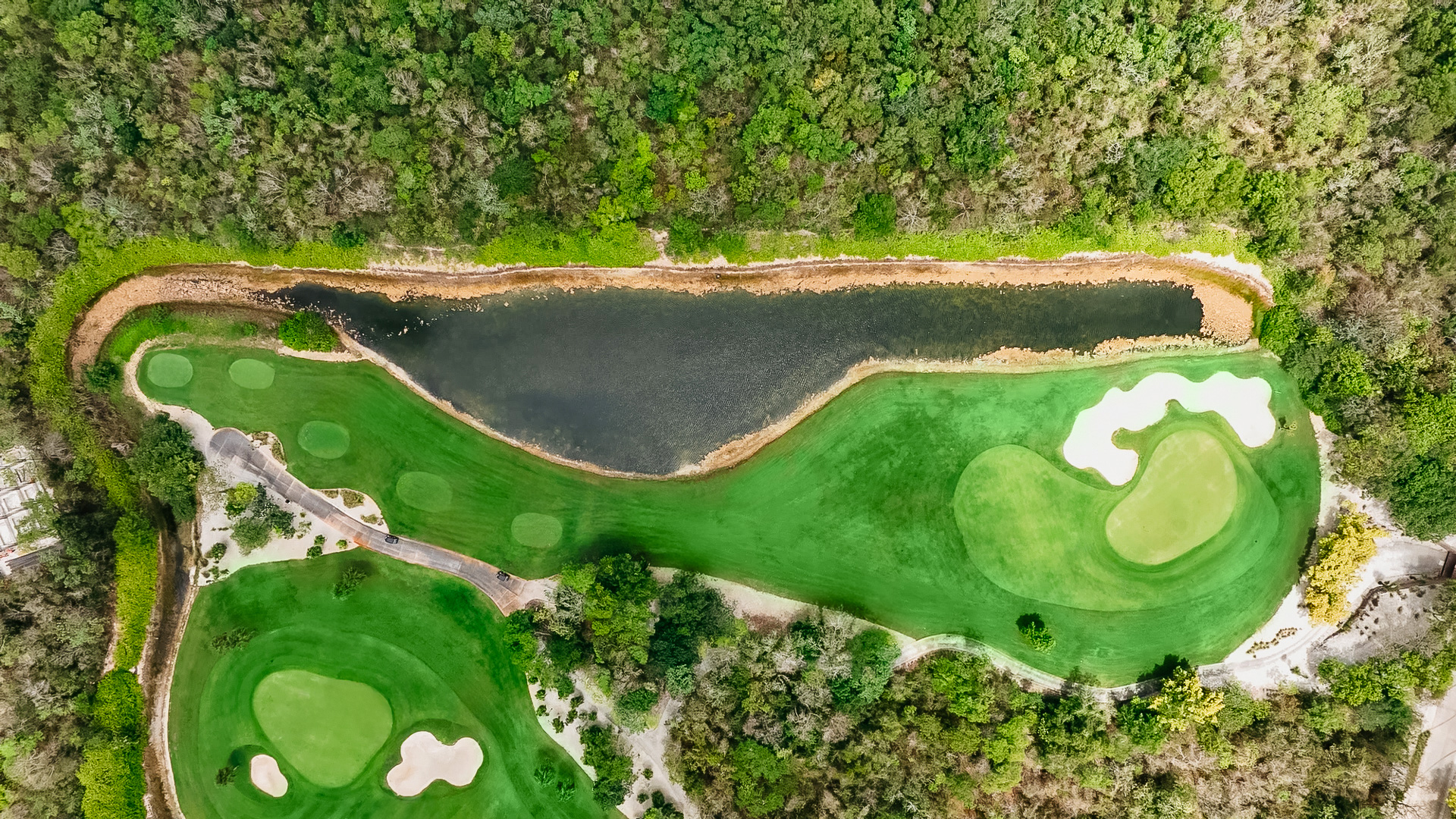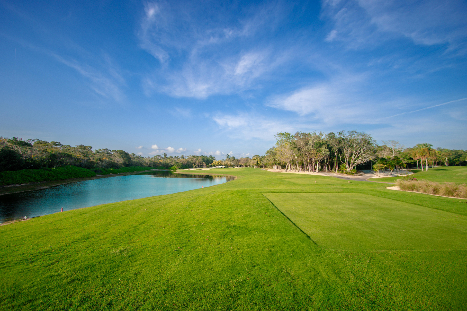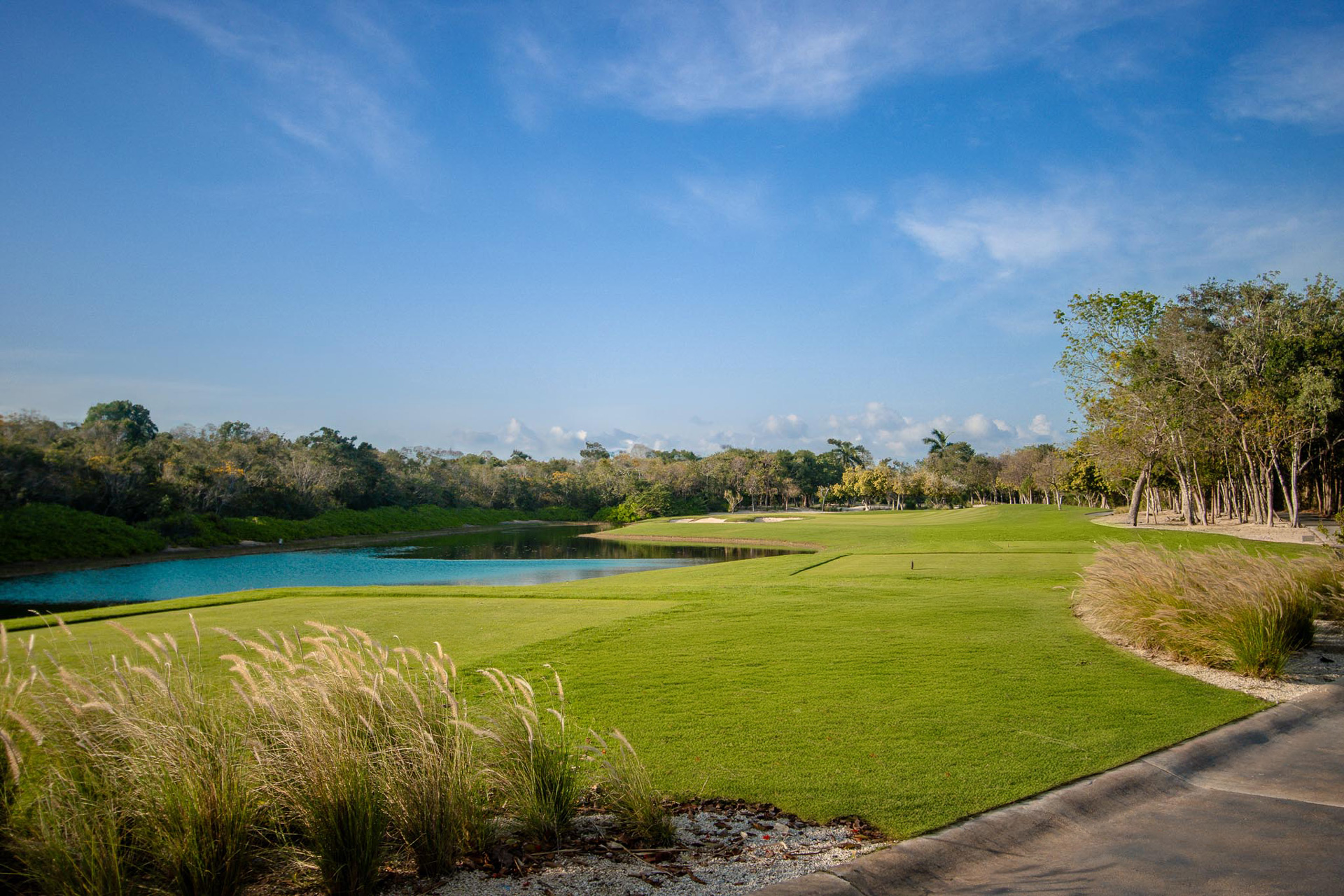 Medium length with bunkers and lake on the left; you can use 3 or 2 clubs depending on the position of the ag and the wind, which is an important factor.