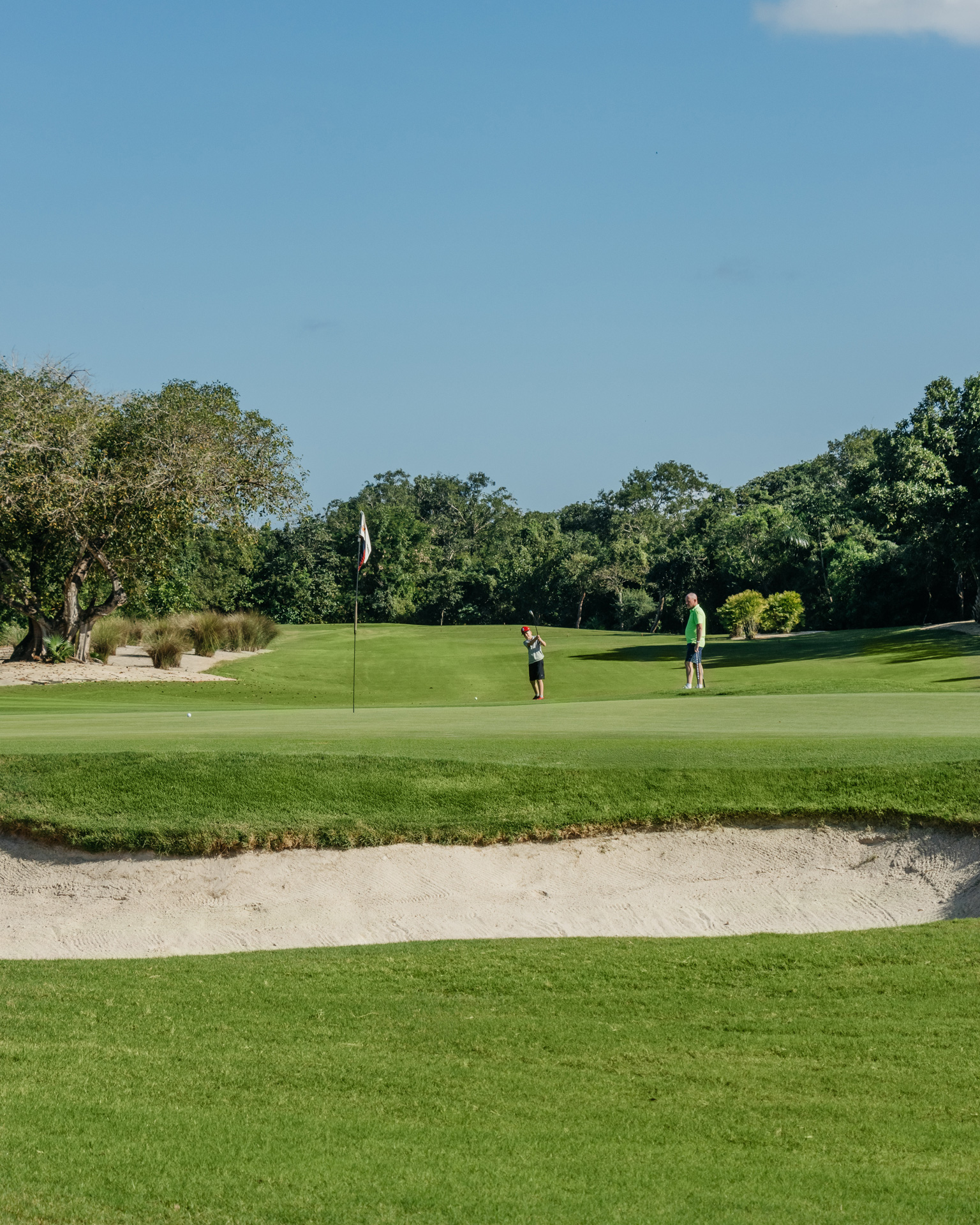 A challenging hole that is well protected by three bunkers, two on the sides and one at the back that can’t be seen from the tee; choose the right club for your shot; the green is at and very wide.